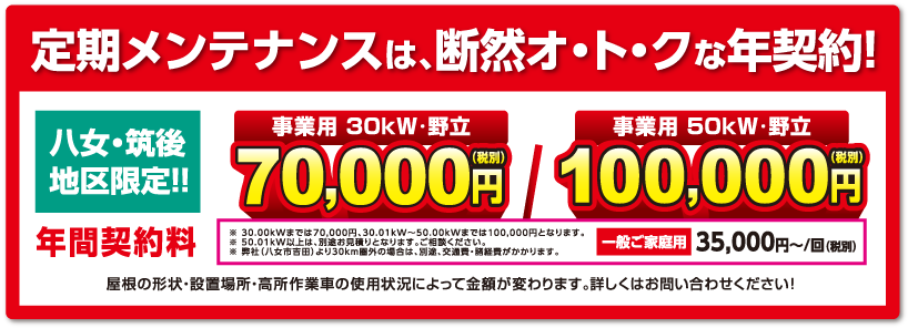 - ※八女・筑後地区以外の遠方の場合(弊社から30km以上離れた場所)は、別途交通費・諸経費がかかります。